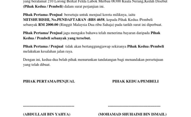 Kami pakar dalam urusan jual beli kereta terpakai. Sahabat 99, sudahkah lihat contoh surat jual beli tanah dalam artikel ini? Surat jual beli tanah berfungsi sebagai bukti otentik dan mempunyai kekuatan hukum untuk menghindari modus penipuan ataupun sengketa yang akan terjadi ke depannya. Artinya, kedua belah pihak bebas menentukan isi dari kesepakatan perjanjian. Sebanyak rm 500 (ringgit malaysia lima ratus sahaja) yang dijelaskan oleh pembeli kepada penjual secara tunai pada tarikh surat perjanjian ini ditanganani.