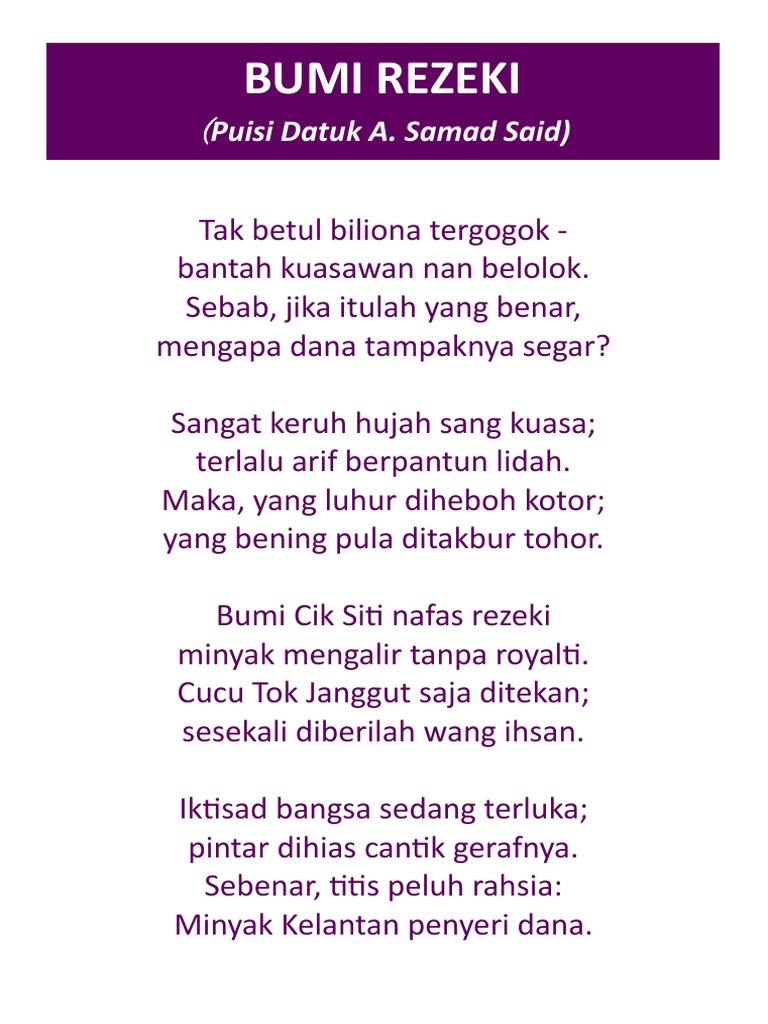 Samad said yang terkenal di malaysia sejak dulu lagi. Lagu kita rindu demokrasi darjat awan ter!nggi mengindah ufuk senja merai kemerdekaan diri. Semasa berumur enam bulan a. Jika kita bekerja dan berikrar hidup bersama. Pengkaji ingin melihat pemikiran a. A samad said dalam perkembangan puisi melayu posts facebook. Sajak ini merupakan sajak yang sangat terkenal dalam bidang sastera negara dan merupakan salah satu karya melayu yang berteraskan islam kerana ia sesuai untuk dijadikan nasihat atau pengajaran kepada pembaca serta pendengar terutamanya orang melayu. Lagu tiga kupang 2012 (2) december 2012 (2) 2013 (2) october 2013 (2) 2015 (1) february 2015 (1) cikgu aziah. Koleksi sajak a samad said. A samad said dalam perkembangan puisi melayu innlegg facebook. Semasa berumur enam bulan, a. Puisi benih harapan a samad said youtube. Sajak a samad said doc.